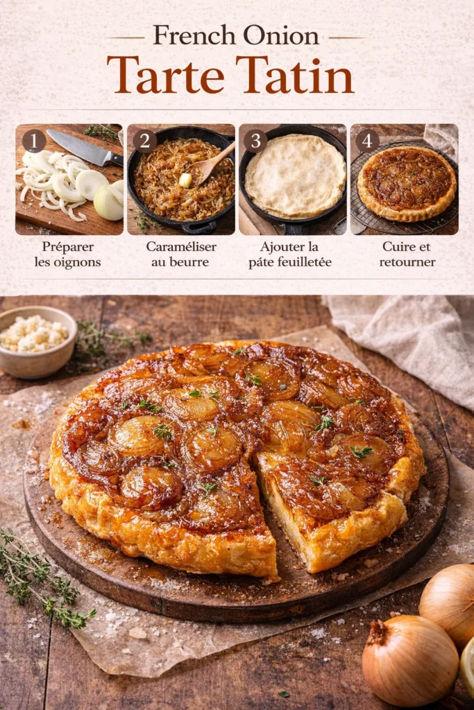 La French Onion Tarte Tatin est une version salée et raffinée de la célèbre tarte tatin. Inspirée de la soupe