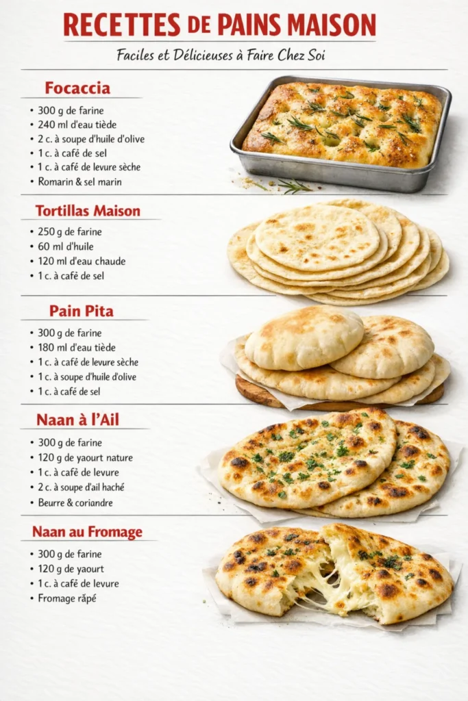 Faire son pain maison est un plaisir simple et gratifiant. Ces cinq recettes — focaccia, tortillas, pita, naan à l’ail