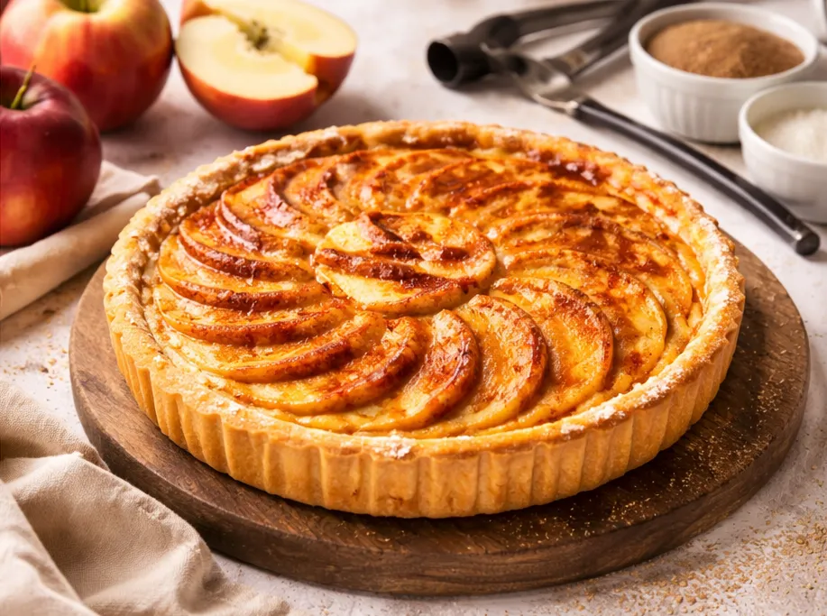 La tarte aux pommes façon crème brûlée est une création pâtissière qui allie deux grands classiques de la gastronomie française
