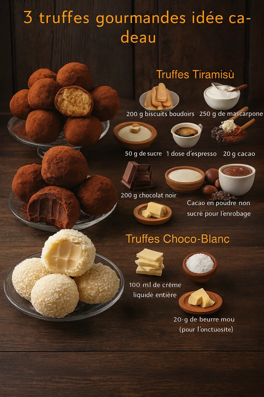 Les 3 Truffes Gourmandes — Chocolat Marrons, Coco-Choco Blanc et Tiramisu — sont une invitation à la gourmandise et à la créativité. Faciles à préparer, elles allient textures fondantes, saveurs équilibrées et présentation élégante. Parfaites pour les fêtes, les anniversaires ou simplement pour faire plaisir, elles transforment un simple cadeau en une expérience gustative raffinée. Chaque truffe raconte une histoire de douceur et de passion, faisant de ce trio un présent aussi beau que délicieux.