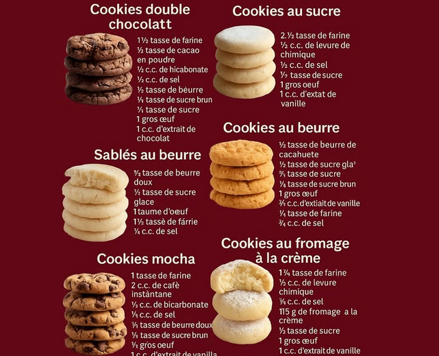 Que vous soyez amateur de chocolat intense, de douceur vanillée ou de textures sablées, ces cookies sont faits pour vous ! Faciles à préparer, ils se conservent plusieurs jours et apportent une touche sucrée à chaque moment de la journée.