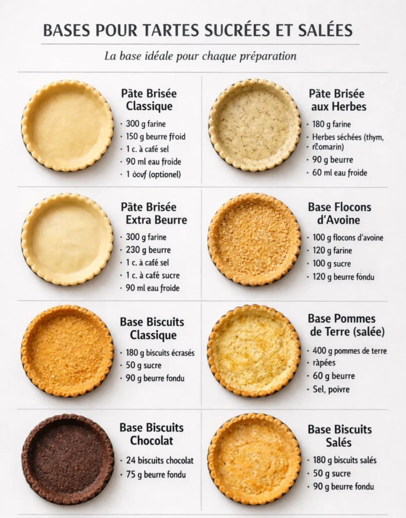 Ces huit recettes de fonds de tarte maison — des pâtes brisées aux bases biscuits et flocons d’avoine — offrent une grande variété de textures et de saveurs. Faciles à préparer, elles permettent de personnaliser chaque tarte, qu’elle soit sucrée ou salée. Préparer sa base maison, c’est garantir un résultat croustillant, savoureux et parfaitement adapté à chaque création culinaire.