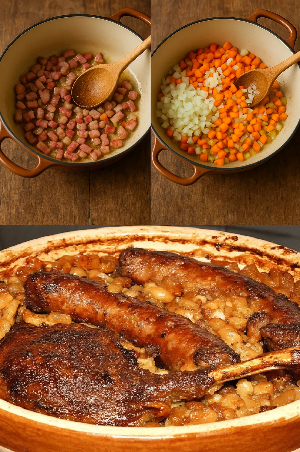 Chaque ingrédient a son rôle à jouer : les haricots blancs absorbent les arômes des viandes, tandis que la graisse de canard apporte rondeur et profondeur. Le temps de cuisson long assure une texture fondante et une harmonie parfaite des saveurs.