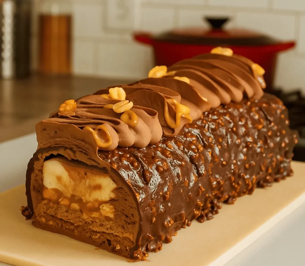 La bûche Snickers maison est un dessert spectaculaire et ultra gourmand qui combine tout ce qu’on aime : le fondant