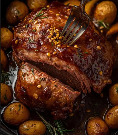 L’alliance du miel légèrement caramélisé, de la moutarde subtilement relevée et de l’ail confit crée une sauce riche et équilibrée, parfaite pour napper la viande et les pommes de terre fondantes qui l’accompagnent.