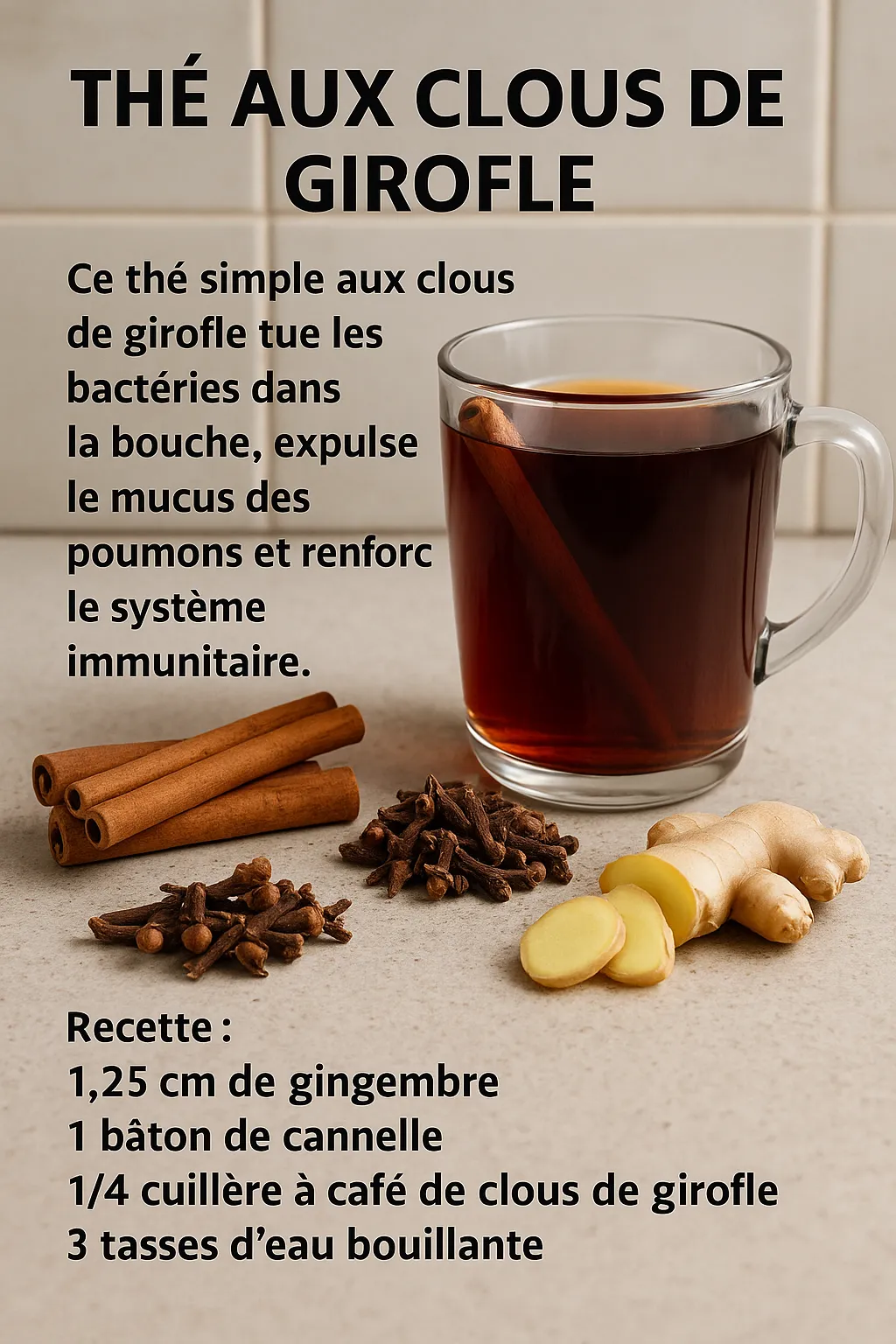 - Infusion au clou de girofle et miel : Idéale pour adoucir la gorge et calmer la toux.