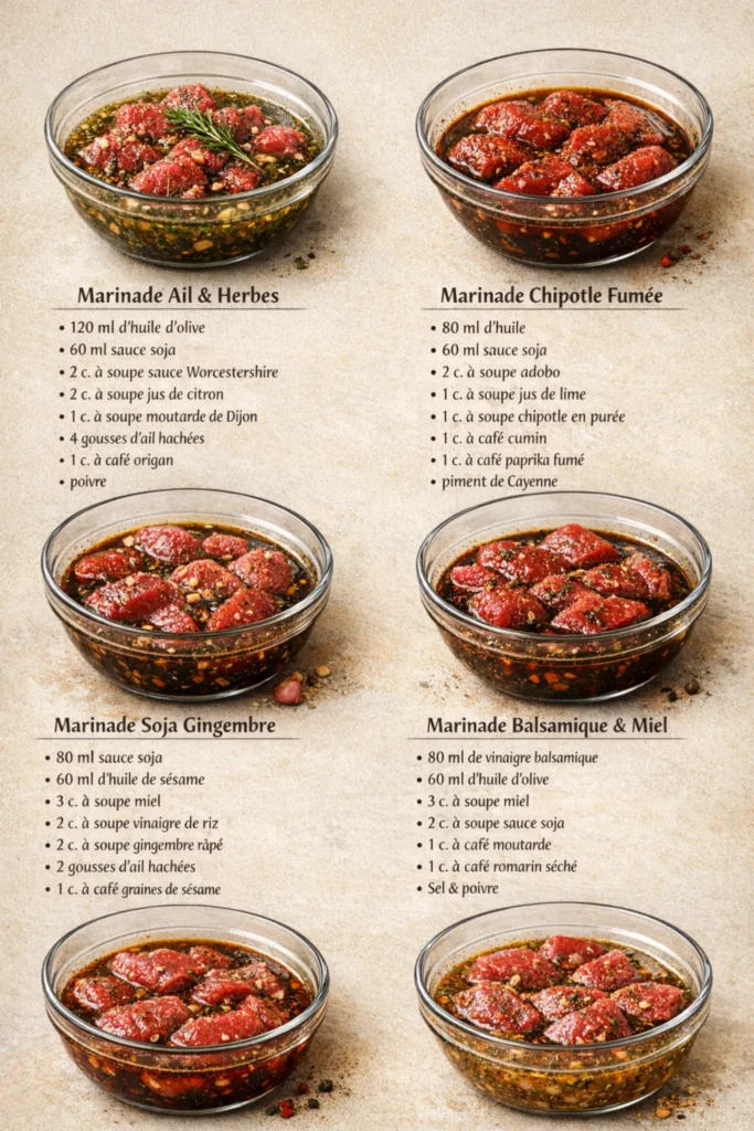 Ces quatre recettes de marinades maison — ail herbes, chipotle fumée, soja gingembre et balsamique miel — permettent de transformer n’importe quel plat en explosion de saveurs. Faciles à préparer, elles s’adaptent à toutes les viandes, poissons ou légumes. Préparer ses marinades maison, c’est redécouvrir le plaisir d’une cuisine simple, parfumée et personnalisée.