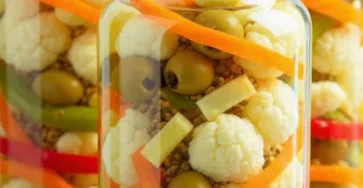 Ces légumes marinés maison, préparés en pickles express, apportent une note vive et aromatique à n’importe quel repas. Carottes croquantes, bouquets de chou-fleur, céleri, poivron et olives s’imbibent d’une saumure …