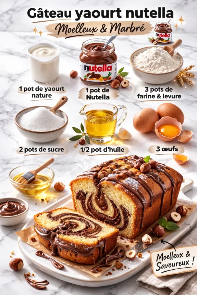 Le gâteau au yaourt et Nutella est une recette simple, rapide et ultra-gourmande. Moelleux à souhait, il marie la légèreté du