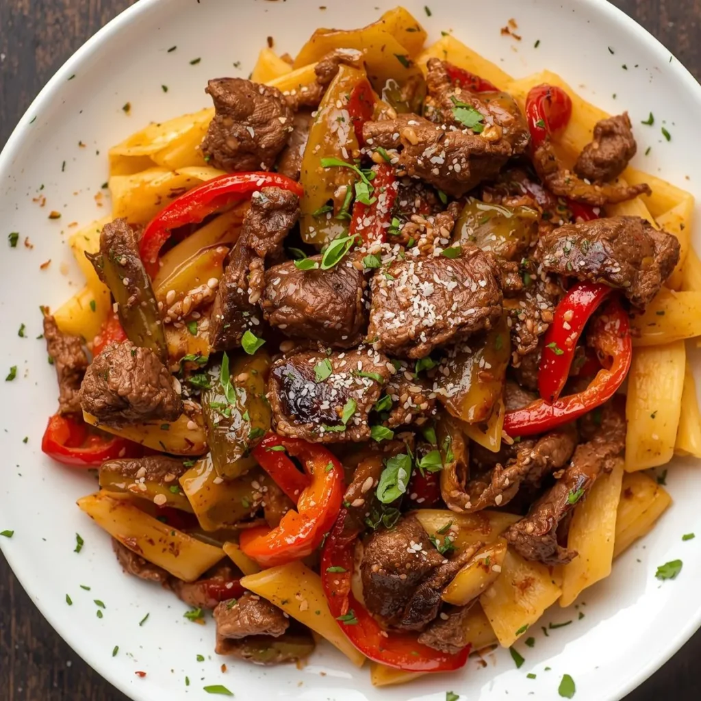 Les pâtes au bœuf sauté et poivrons incarnent la convivialité, la gourmandise et la simplicité de la cuisine familiale. Ce plat, à la