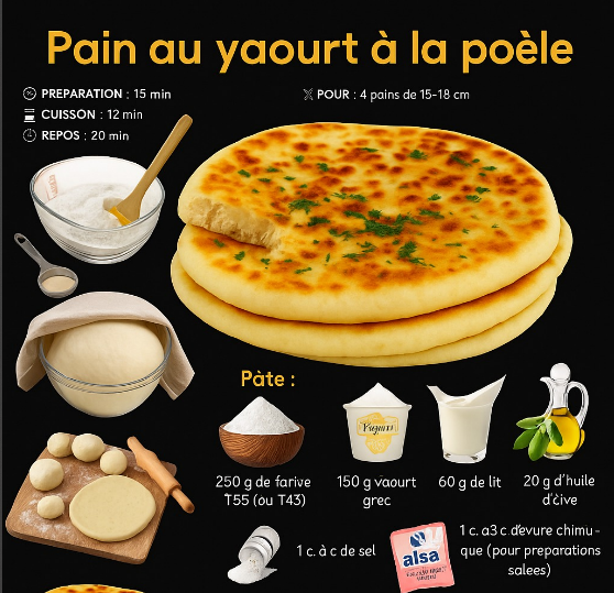 Qui n’a jamais rêvé de préparer un pain maison sans four, sans levure de boulanger, et surtout en un temps record ? Le pain au yaourt à la poêle est une véritable révolution culinaire ! Moelleux à l’intérieur, doré à souhait à l’extérieur, il se prépare en quelques minutes avec des ingrédients simples que nous avons tous dans nos placards.