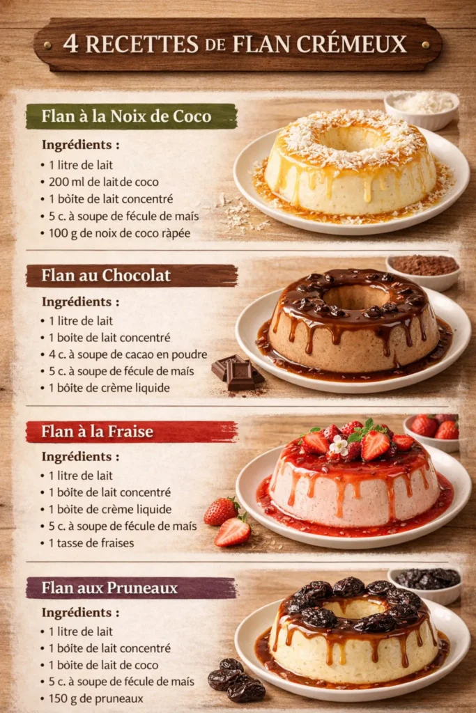Ces quatre recettes de flans maison — noix de coco, chocolat, fraise et pruneaux — offrent une variété de saveurs et de textures pour tous les goûts. Faciles à préparer, sans cuisson au four, elles sont parfaites pour un dessert rapide, frais et gourmand. Chaque version peut être adaptée selon les envies, pour un résultat toujours onctueux et savoureux. Ces flans sont la preuve qu’un dessert simple peut être à la fois raffiné et réconfortant, idéal pour toutes les occasions.