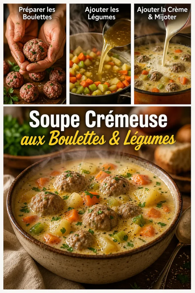 Préparer une soupe crémeuse aux boulettes et légumes, c’est retrouver le plaisir des plats faits maison, simples et généreux. C’est un repas complet, équilibré et réconfortant, parfait pour les soirées d’hiver ou les repas en famille. Sa texture veloutée, ses arômes de légumes frais et la tendresse des boulettes en font un plat universellement apprécié. Cette recette prouve qu’il n’est pas nécessaire de passer des heures en cuisine pour créer un plat savoureux et nourrissant. Avec quelques ingrédients de base, un peu de patience et beaucoup d’amour, cette soupe devient un véritable symbole de la cuisine familiale. Elle rappelle que les meilleures recettes sont souvent les plus simples, celles qui réchauffent le cœur autant que le corps.