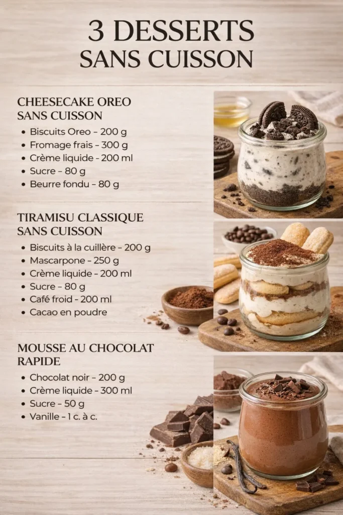 Ces trois desserts sans cuisson — cheesecake Oreo, tiramisu classique et mousse au chocolat rapide — sont la preuve qu’il est possible de se régaler sans allumer le four. Faciles à préparer, ils allient gourmandise, fraîcheur et simplicité. Le cheesecake séduit par sa texture fondante et son croquant, le tiramisu enchante par sa douceur italienne, et la mousse au chocolat reste un grand classique indémodable. Ces recettes sont parfaites pour toutes les occasions, qu’il s’agisse d’un dîner entre amis, d’un repas de famille ou d’une envie sucrée de dernière minute. Grâce à leur préparation sans cuisson, elles garantissent un résultat délicieux, élégant et sans effort.