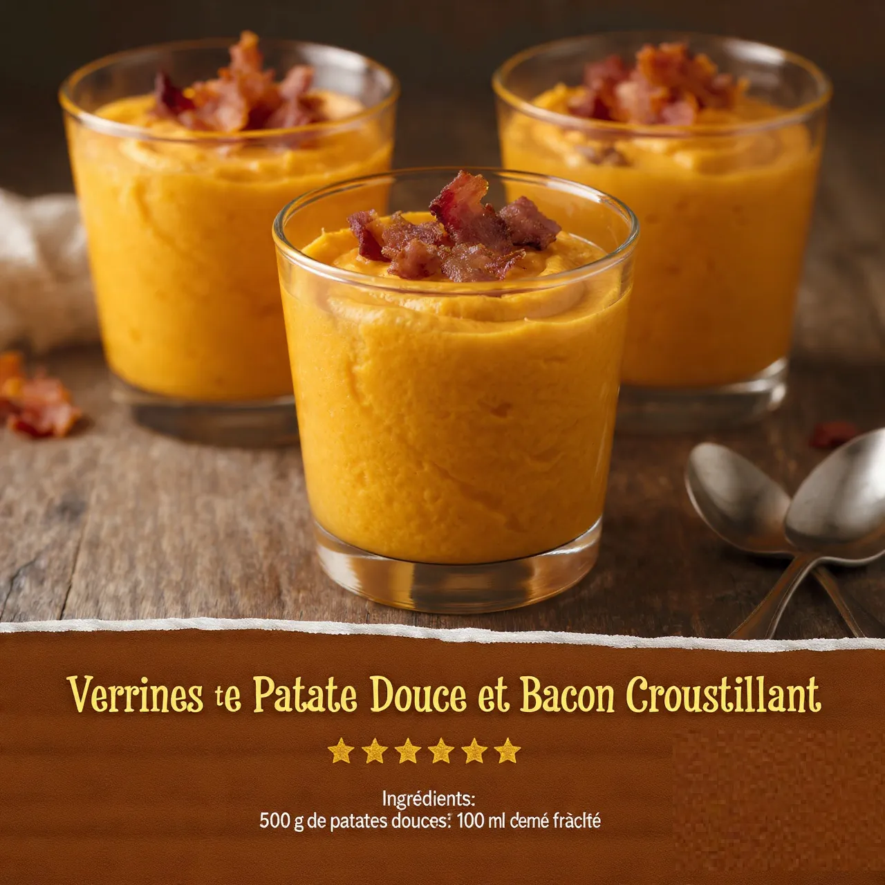 Les Verrines Mousse de Patate Douce & Bacon Croustillant sont une explosion de saveurs et de textures en une seule bouchée. La douceur veloutée de la patate douce s’accorde parfaitement avec le croquant salé du bacon, créant un équilibre gourmand et raffiné. Cette recette simple et élégante est idéale pour un apéritif festif, une entrée originale ou un buffet dînatoire.