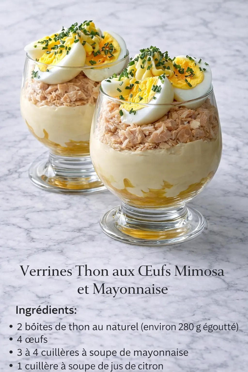 Ces verrines mettent en valeur des ingrédients simples mais savoureux. Le thon apporte une note marine, les œufs mimosa une texture fondante et la mayonnaise une touche crémeuse. Présentées en couches, elles offrent un jeu de couleurs et de textures qui séduisent autant les yeux que le palais.